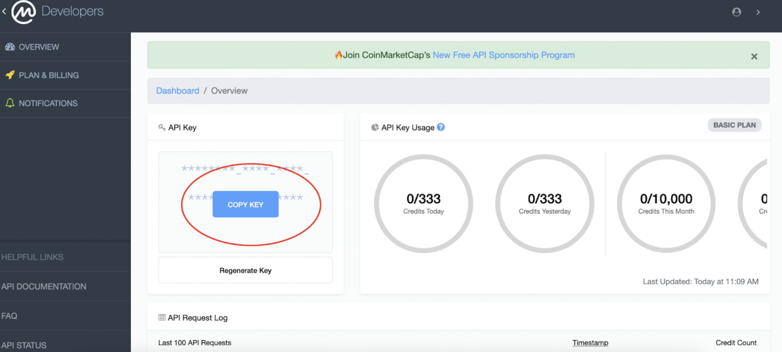 Po dokončení registrace se zobrazí rozhraní účtu. Přesuňte myš na pole API Key a zobrazí se tlačítko Copy this API Key, které chcete použít v dalším kroku.