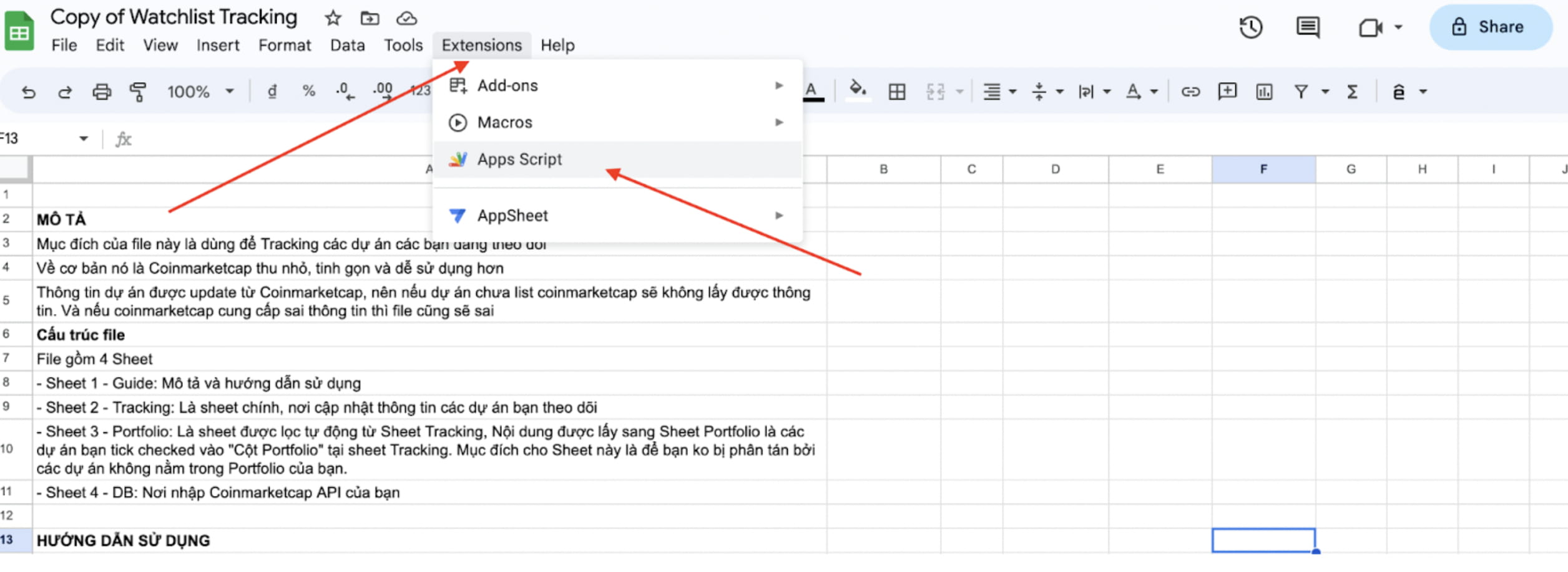 Tento sloupec znamená, které projekty jsou ve vašem investičním portfoliu, takže klikněte na zaškrtnuté, abyste je mohli lépe sledovat. Druhým účelem je, aby skript identifikoval a aktualizoval samostatný 3. list – Portfolio.
