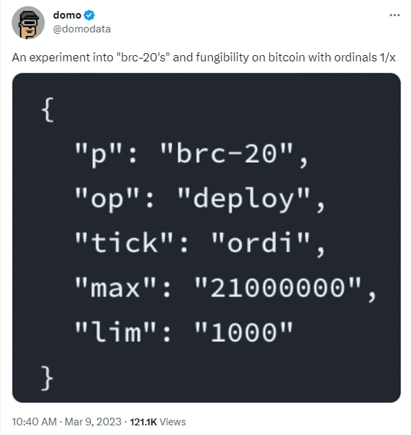 Standard tokenu BRC-20 vytvořil uživatel Twitteru domodata. V současnosti se jedná pouze o experimentální standard výměnných tokenů a samotný token má malou hodnotu.