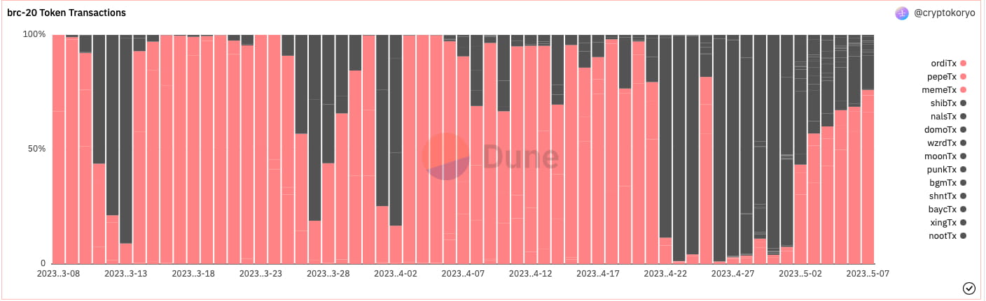1/ Bitcoinový tokenový standard BRC-20 bere krypto ekosystém útokem, zejména s nárůstem meme coinů jako Pepe a Meme. Více než 8 500 tokenů bylo vyraženo pomocí standardu BRC-20, přičemž většinu tvoří meme mince.