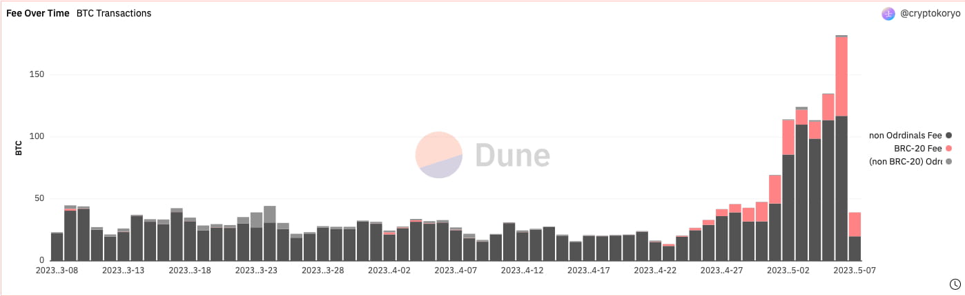 4/ Nárůst transakcí BRC-20 však vedl k výraznému nárůstu transakčních poplatků, což od konce dubna generovalo dalších 286 BTC v poplatcích pro těžaře. Meme coin šílenství také vedlo ke zvýšení poplatků za plyn v síti Ethereum a přetížení sítě.