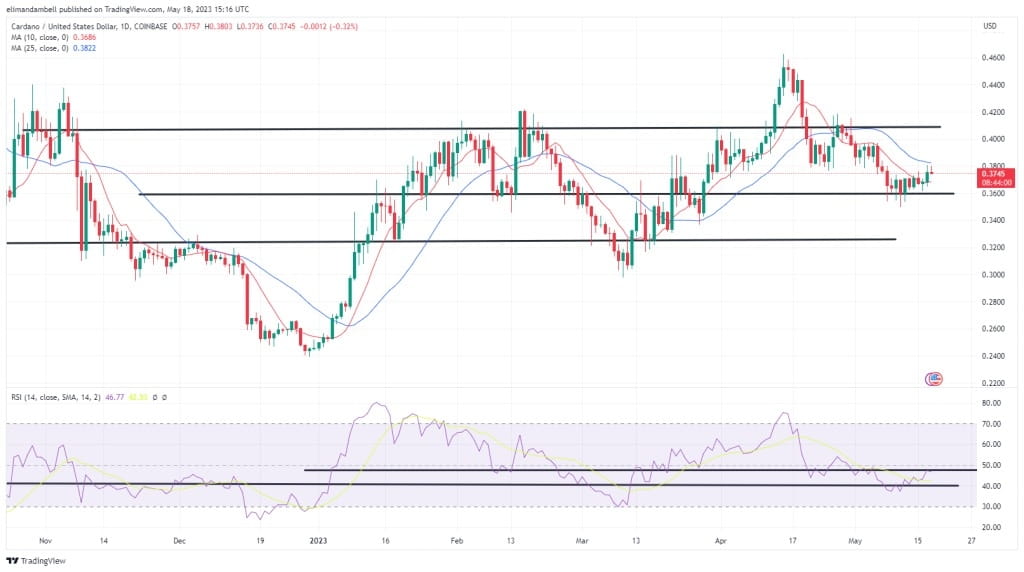 ADA/USD vyskočilo na intradenní maximum $0.3798 dříve dnes, což navazuje na středeční minimum na $0.3658.