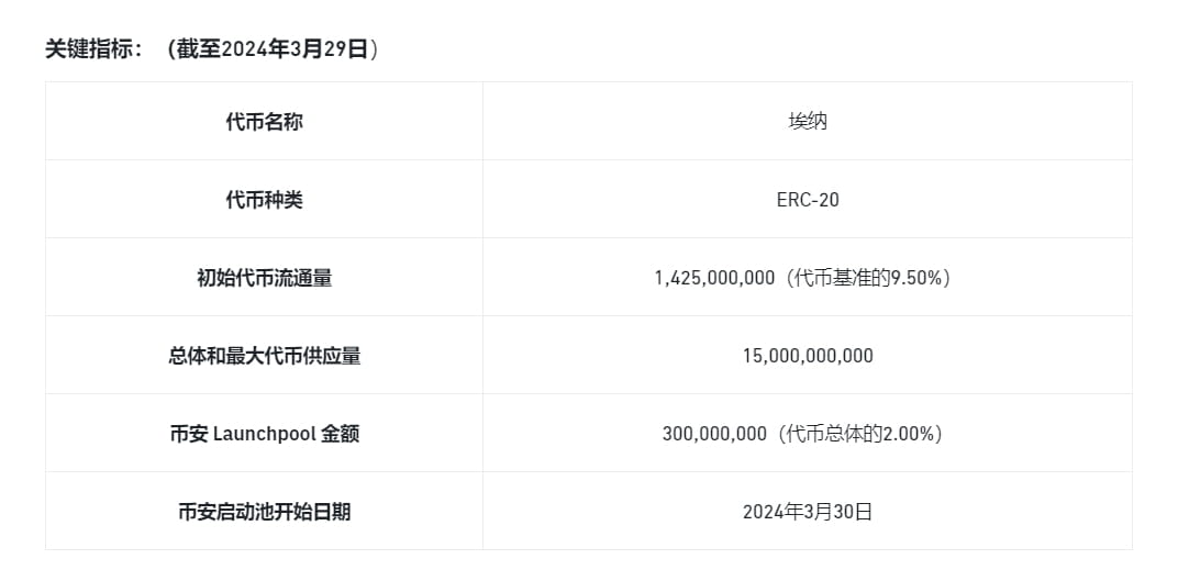 29. března 2024 byla celková dodávka ENA 150 000 000 000, s počáteční oběžnou zásobou 1 425 000 000 při spuštění (přibližně 9,5 % z celkové zásoby tokenů)