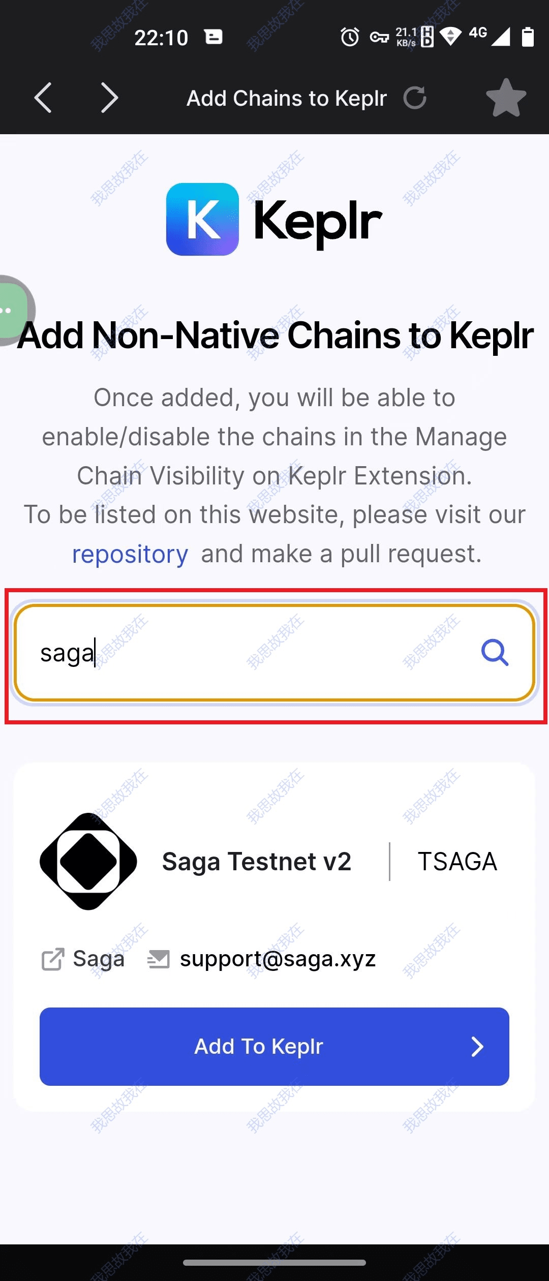 (Možná budete potřebovat žebřík. Nemohu otevřít webovou stránku pro přidání řetězu.) Přidejte odpovídající konfiguraci řetězu Jako příklad se zdá být řetěz SAGA vestavěný v nejnovější verzi Keplr můžete nejprve vyhledat ságu, abyste zjistili, zda ji lze najít, můžete tento krok přímo přeskočit.
