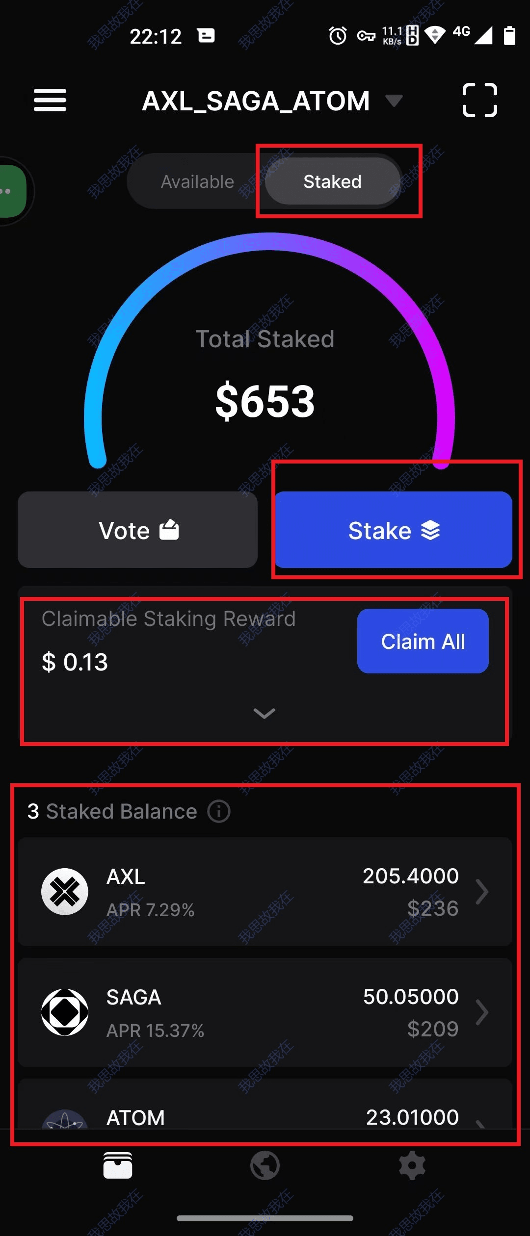 Vraťte se na domovskou stránku peněženky a klikněte na "Stakeed" v horní části pro vstup do panelu sázek. Střední část jsou odměny za sázky, které lze aktuálně nárokovat, spodní část jsou zastavené mince Po kliknutí můžete přejít přímo k zastaveným uzlům. Klikněte na "Stake" pro vstup do rozhraní vytyčování