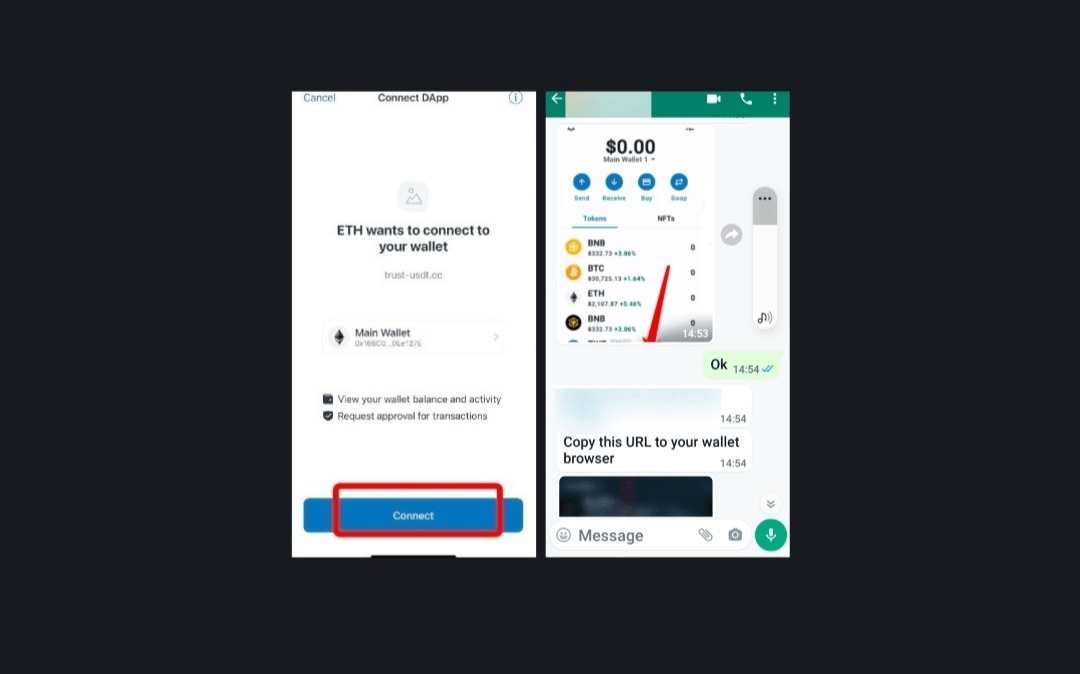 Jakmile podvodníci získají pozornost a důvěru uživatele, provedou je řadou propracovaných kroků k odemknutí vzrušující „investiční příležitosti“. Tyto pokyny mohou zahrnovat sdílení zdánlivě bezpečného odkazu WalletConnect k navázání spojení mezi uživatelem a „DApp“.