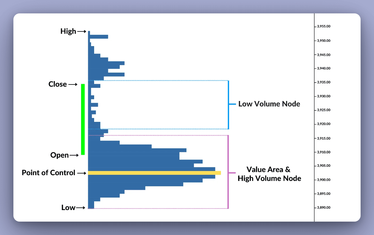 Objemový profil v podstatě bere celkový objem zobchodovaný na konkrétní cenové hladině během zadaného časového období a rozděluje celkový objem buď na vyšší objem (obchody, které posunuly cenu nahoru), nebo na nižší objem (obchody, které posunuly cenu dolů), a poté vytvoří tyto informace snadno viditelné pro obchodníka.