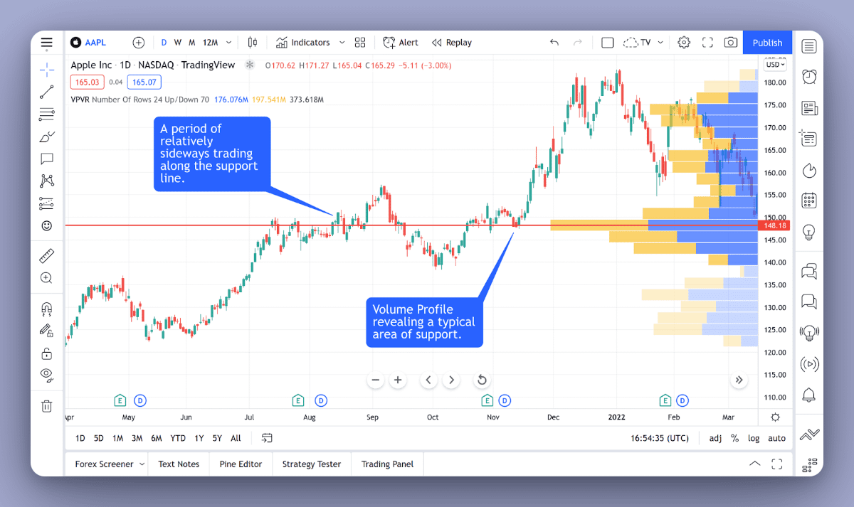 Pruhy jsou uspořádány svisle, přičemž vyšší pruhy označují oblasti s vyšší obchodní aktivitou. Obvykle mohou jako podpěrné úrovně sloužit vysoké tyče.
