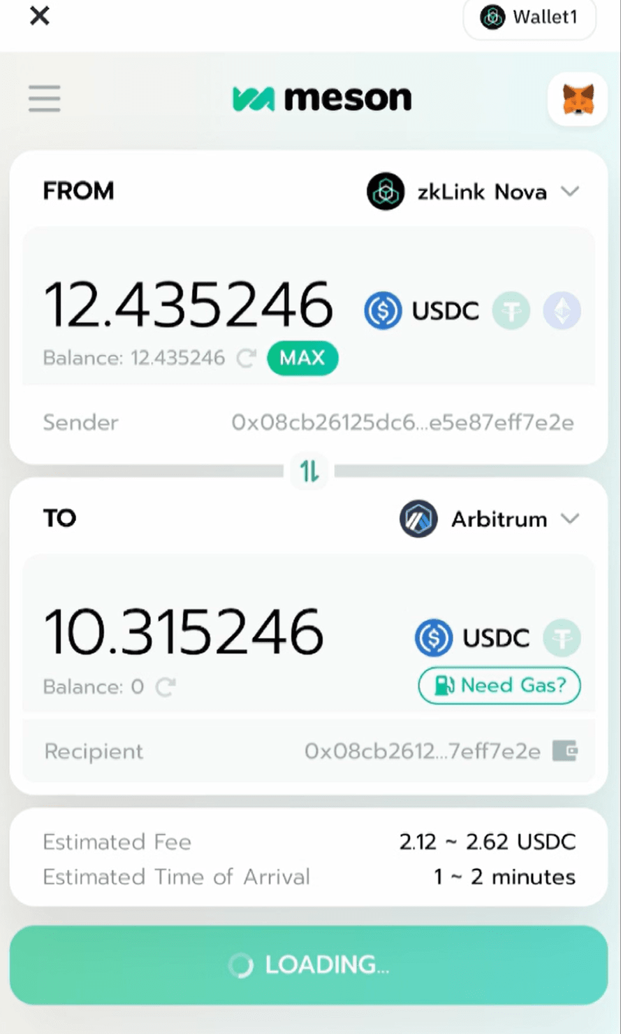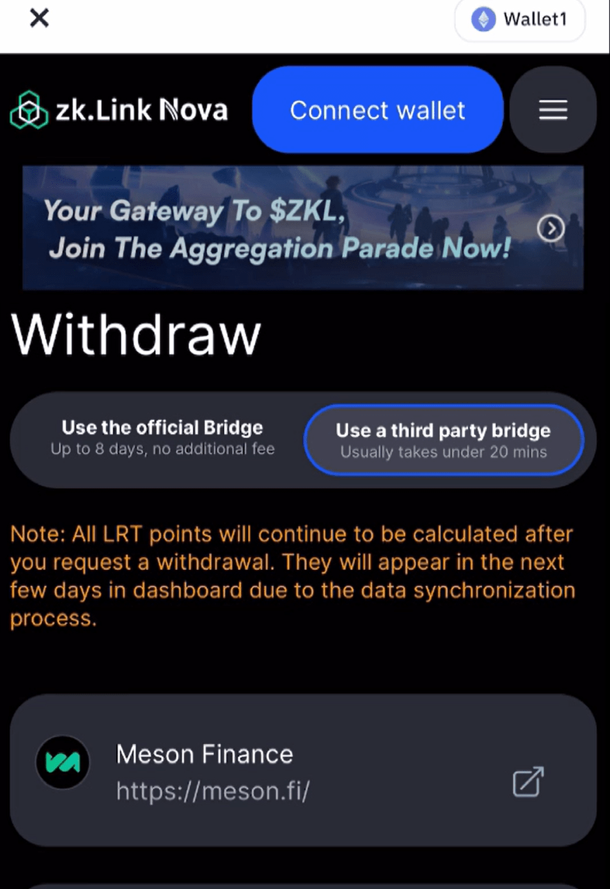 Poslední a nejdůležitější věcí je, jak převést aktiva řetězce zkLink Nova, která nejsou podporována Binance, zpět do řetězce Arbitrum V první úloze se vraťte zpět do zkLink Nova a změňte pravý horní roh na výběr zde uvedené metody, které nestojí manipulační poplatek, ale musíte počkat 8 dní (ve skutečnosti to stále vyžaduje poplatek za interakci se smlouvou ve výši asi 0,00013 eth) a pomocí mostu třetí strany počkat několik minut Brother demonstruje druhou metodu, klikněte na Meson Finance, to je velmi užitečný Dapp, obrazovka je jednoduchá a jasná a podrobnosti o převodu jsou jasně informovány Připojte peněženku k výběru veřejného řetězce pro konverzi a převeďte USDC a ETH Tento proces bude stát spoustu poplatků za plyn, ale s tím nemůžete nic dělat, počkejte 5–10 minut a obě naše aktiva se vrátí do peněženky.