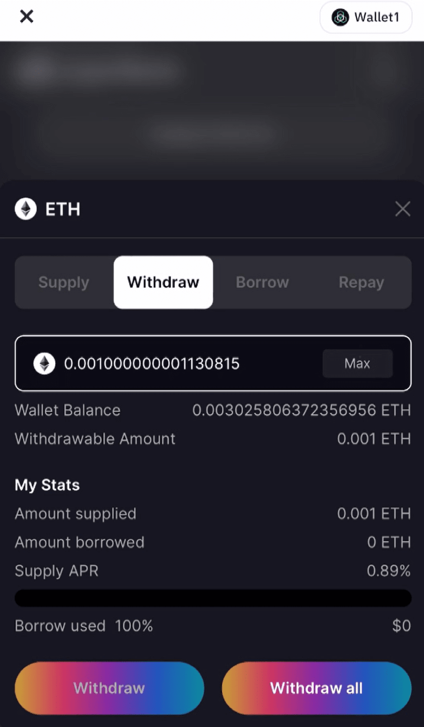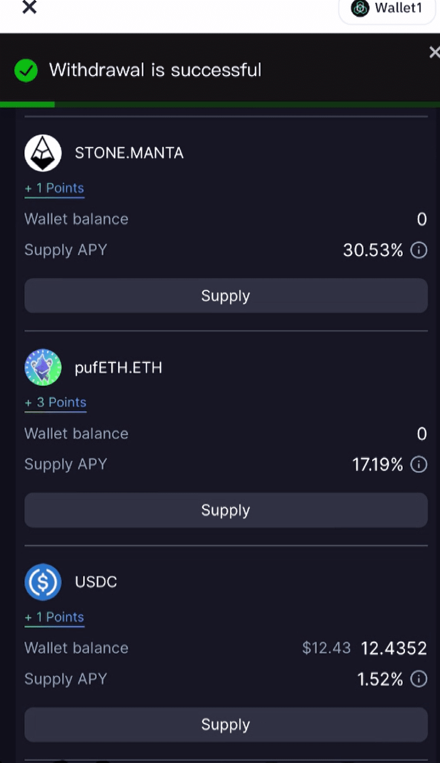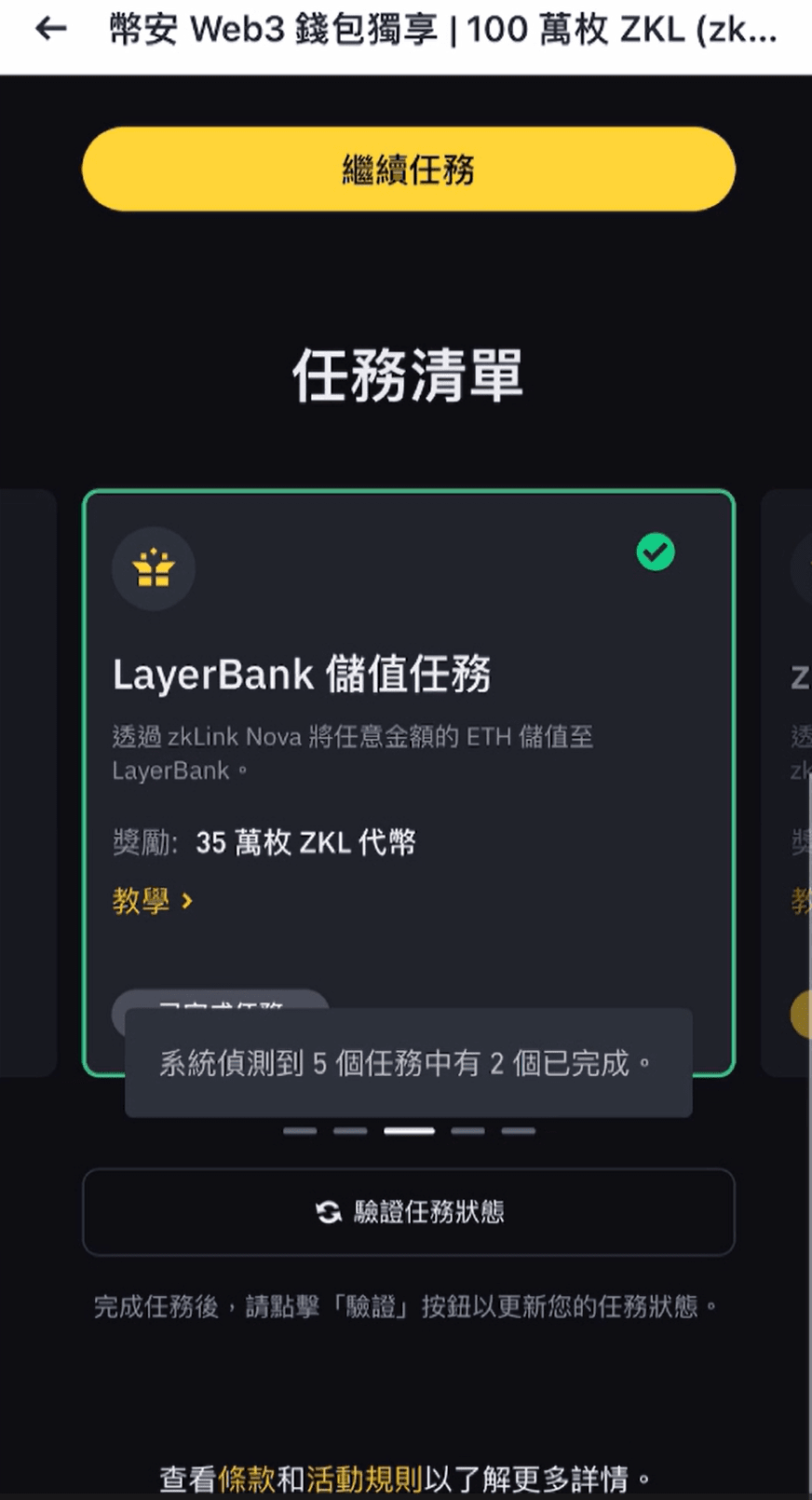 Pak jsme bez přestání rychle přešli k druhému úkolu, Vklad v LayerBank, určitě si pomyslí, proč bychom měli přeskočit předchozí úkoly a udělat to jako první Je to jen proto, že bratr J věří, že tento úkol lze provést pouze pomocí ETH hodnota se shoduje s naším předchozím úkolem, takže to uděláme nejprve Klikněte na LayerBank Nejprve propojíme peněženku a řetězec zkLink Nova Zde uvidíte, že existuje mnoho uložených hodnot, jako je USDC, USDT atd úkol Používáme pouze ETH, takže se řiďte předpisy zde a možná zjistíte, že v peněžence není žádný zůstatek uvízly zde a nelze provést, musíte znovu kliknout na Dostupné jako zajištění, aby se zobrazila možnost připojení peněženky, poté znovu kliknout na Binance web3 peněženka, akci zopakovat a stisknout Supply & Borrow, zobrazí se zůstatek peněženky V prvním úkolu přejdeme na ETH řetězce zkLink Nova, poté vyplníme 0,001 ETH, stiskneme tlačítko Dodávka, dokončete interakci se smlouvou a uvidíte úspěšnou půjčku, a poté okamžitě stáhneme prostředky, abychom tomu zabránili. zapomenete vybrat peníze a nebudete se moci zúčastnit následných úkolů. Také počkejte 2 minuty, vraťte se na stránku a stiskněte ověřit. Ukáže se, že dva z pěti úkolů byly dokončeny.