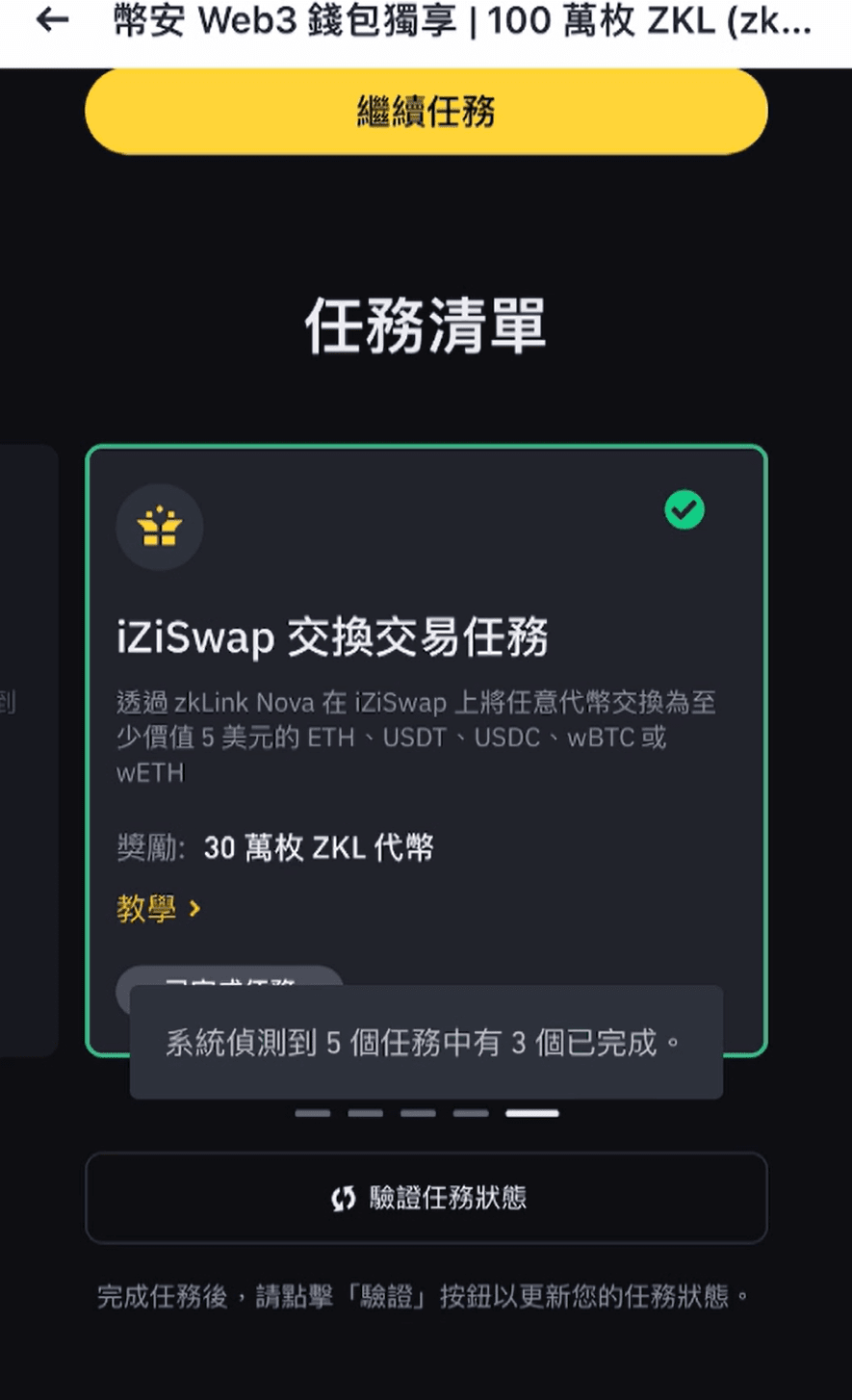 Třetí úkol je také skok, převést ETH na našem řetězci zkLink Nova na USDC, takže je to dokončeno přes iZiSwap. Pokud přítel měny udělá chybu v připojení peněženky Zavřete a znovu otevřete aplikaci Binance a potvrďte, že je připojena k řetězci Nova. Můžete stisknout tlačítko Swap, dokud se neobjeví zůstatek v peněžence. Zde si také musíte zarezervovat nějaký poplatek za plyn pro interakci se smlouvou bude dokončeno, stiskněte Ověřit a dokončili jste tři položky.