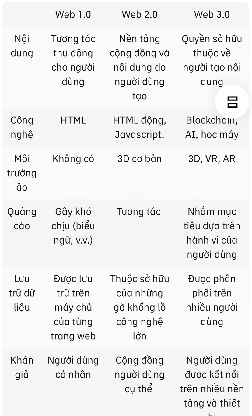Stručný přehled klíčových rozdílů mezi Webem 1.0, 2.0 a 3.0 naleznete v naší tabulce níže: