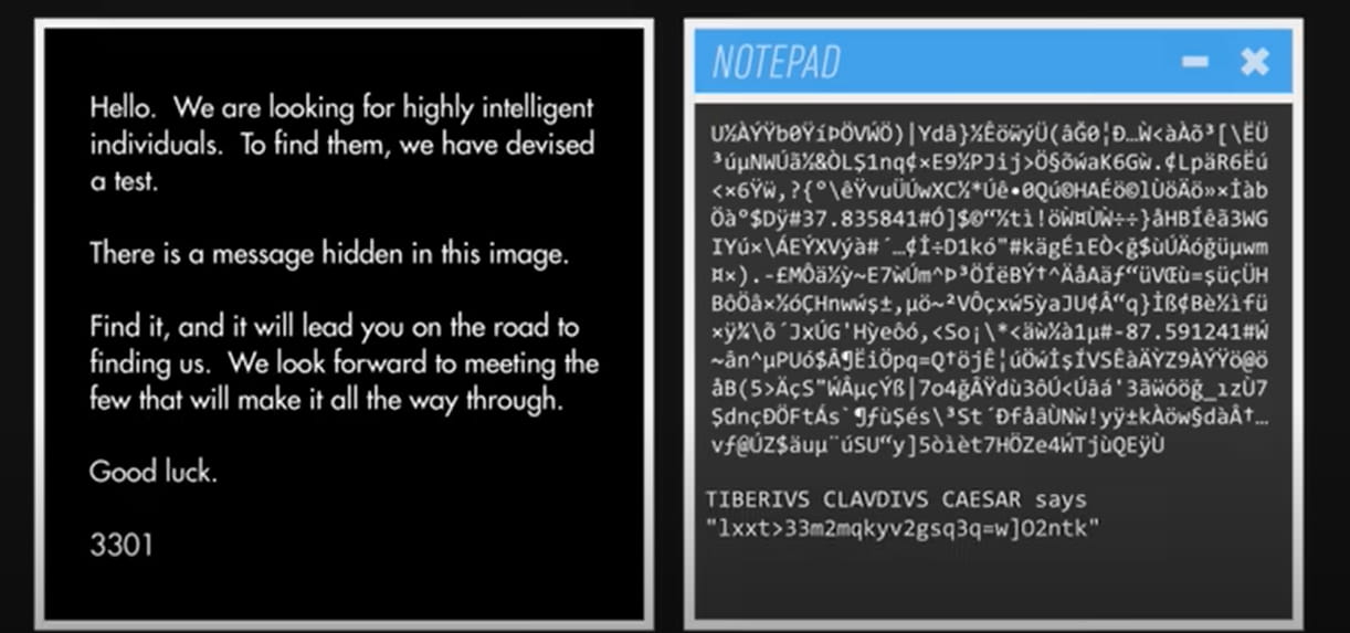 Puzzle Cicada 3301 začíná od samotného obrázku. Zpočátku se nám zdá, že pouhým okem nic nenajdeme. Když však obrázek otevřete v textovém editoru, jako je poznámkový blok na vašem počítači, najdete "odkaz na caesar cypher" úplně dole. V podstatě záhadný hypertextový odkaz na obrázek.