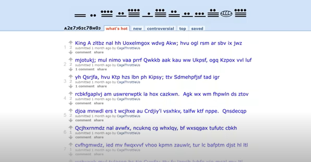 Zpět na webu reddit si jeden uživatel všiml mayských číslic v horní části subredditu. Pomocí těchto přesných kódů můžeme rozluštit bláboly 128 na smysluplné věty. Spojením všech vět dohromady získáme celou stránku knihy s názvem "Mabinogion".