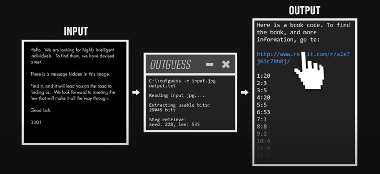 Odkaz Cypher vás zavede na obrázek kachny, který se může zdát jako slepá ulička. Tím, že z obrázku vzali nápovědu ze slov „out“ a „hádej“, ale luštitelé hádanek použili aplikaci nazvanou „outguess“. Outguess je aplikace, pomocí které mohou uživatelé extrahovat skryté soubory nebo text zašifrovaný do obrázku.
