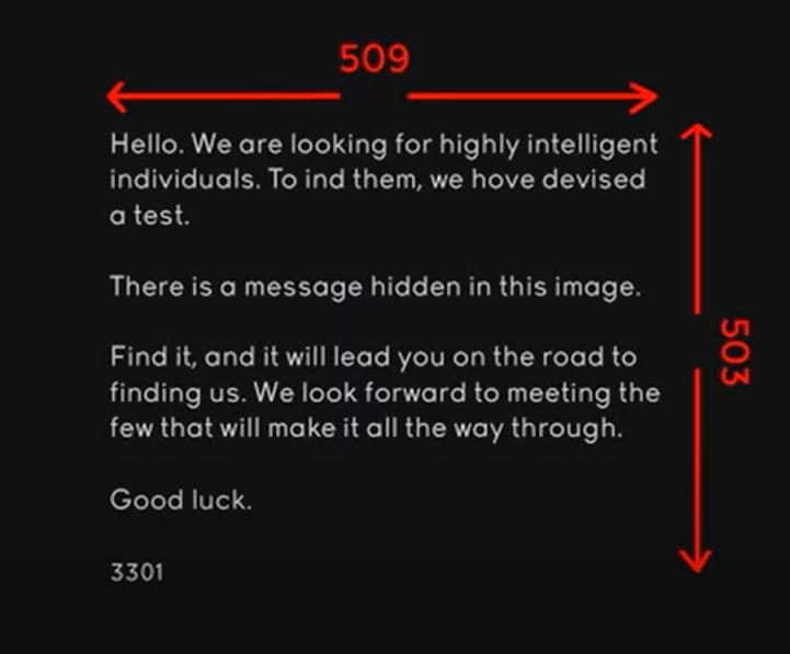 Zpět na úplně prvním obrázku nenajdeme žádné číslo, samozřejmě kromě "3301". Zdálo se, že ani otevření obrázku v textovém editoru nebo přemýšlení obrázku nepomohlo. Byly to rozměry obrázku, délka a šířka obrázku. Vynásobením všech tří čísel a přidáním "www." a ".com", získáme odkaz.