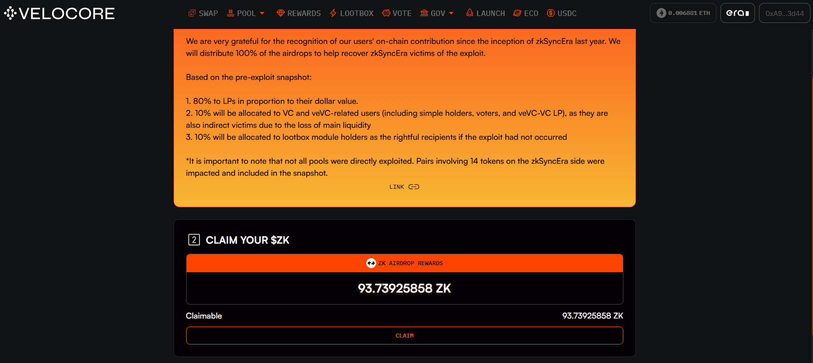 Zřetězení: https://zksync.velocore.xyz/zk-airdrop