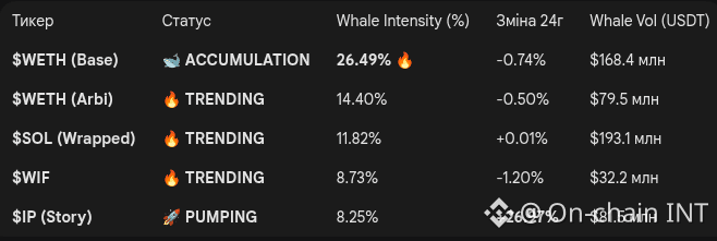 Мемкоїни ($WIF, $PEPE, $FARTCOIN): Незважаючи на легку корекцію ціни, ці активи залишаються в статусі Trending. Особливо виділяється $PEPE з обсягом китових транзакцій у $142 млн, що вказує на те, що великі тримачі не поспішають фіксувати прибуток, очікуючи на нові хаї.