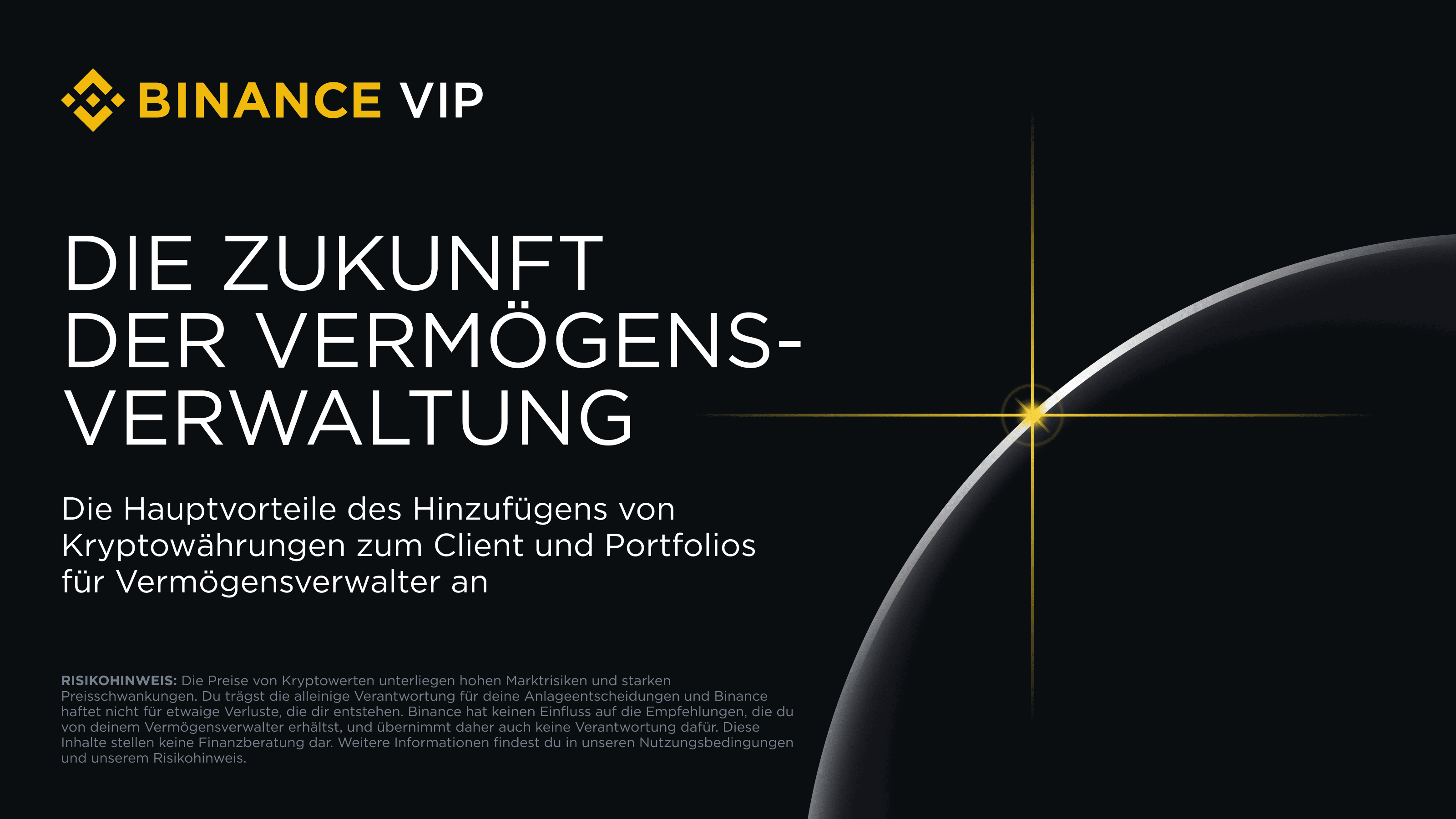 Mach den nächsten Schritt bei der Veränderung deiner Vermögensverwaltungsstrategie. Besuche Binance Wealth noch heute, um mehr darüber zu erfahren, wie du Kryptowährungen nutzen kannst, um deinen Kunden einen außergewöhnlichen Mehrwert zu bieten.