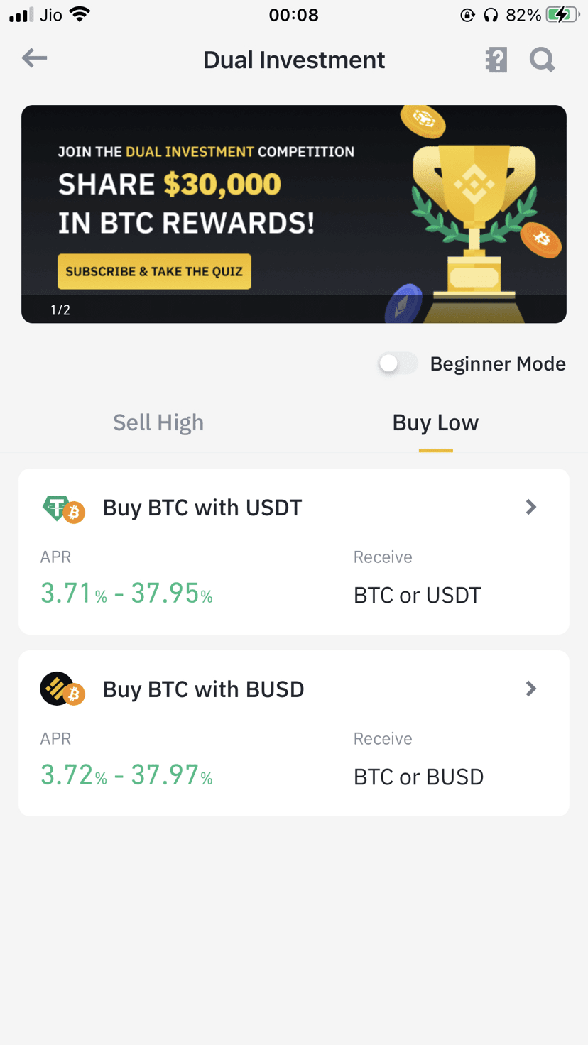 Ich habe auch in Dual Investment investiert und glauben Sie mir, es war das beste Kryptoprodukt für mich. Ich habe einen tollen effektiven Jahreszins erzielt und mir manchmal auch ein paar hochwertige Münzen zu einem guten Preis ergattert und sie auch zu einem Preis verkauft, zu dem ich mein ganzes Gepäck verkaufen wollte 🤑.
