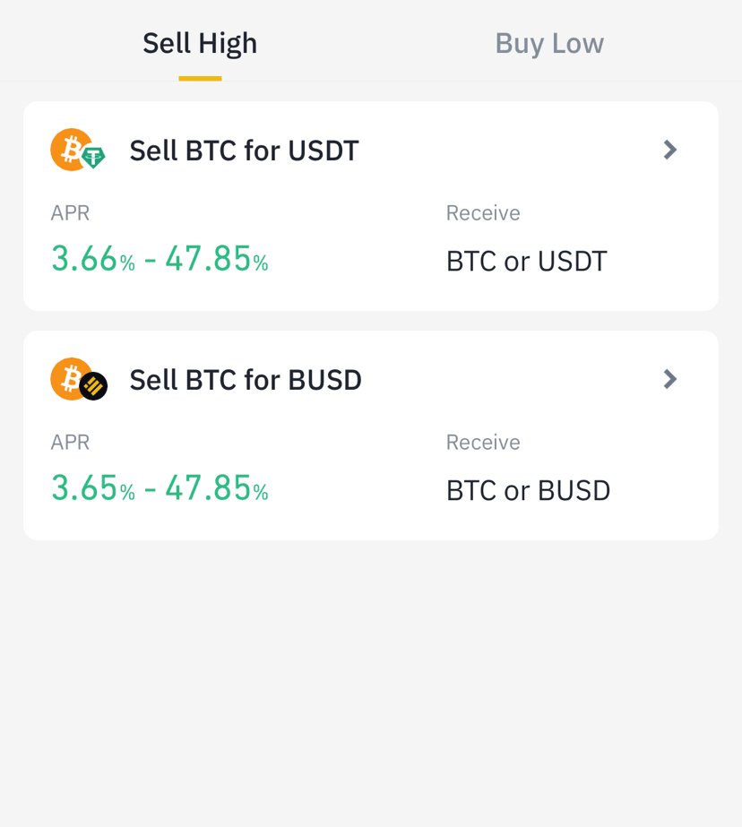 Dual Investment ist ein Verdienstprodukt von Binance. Es hilft Ihnen dabei, teuer zu kaufen oder günstig zu verkaufen und gleichzeitig effektiven Jahreszins zu verdienen.