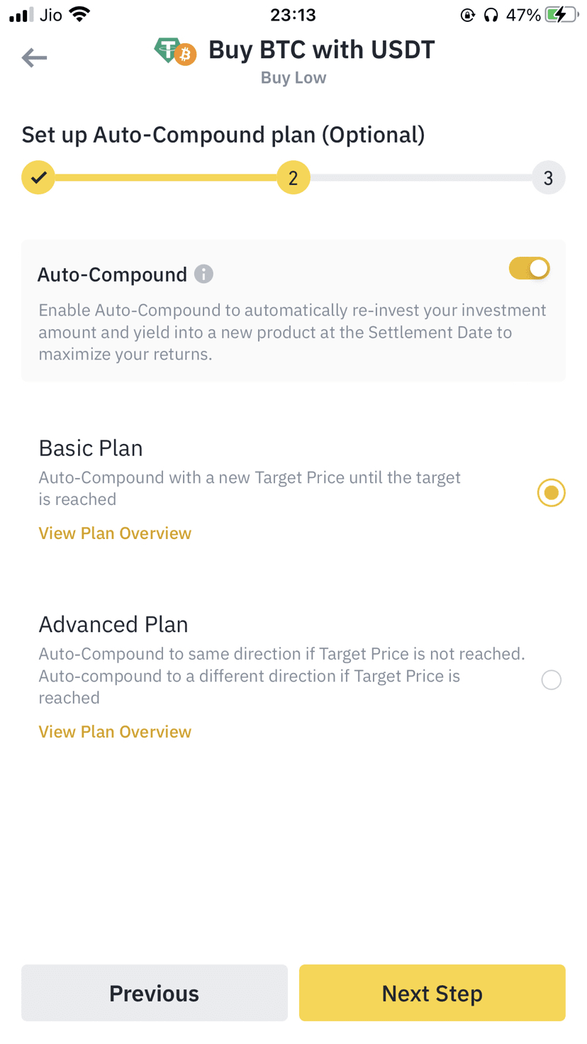 Beispiel: Angenommen, Sie investieren 1000 $, um einen beliebigen Vermögenswert (sagen wir BNB) zu einem bestimmten niedrigen Preis zu erwerben. Wenn der Marktpreis diesen Preis erreicht, erhalten wir bis zum Abwicklungsdatum die Münze (hier angenommen BNB) + den auf der Auswahlseite angegebenen Jahreszins, beides in Form des Vermögenswerts, den Sie erwerben möchten (in diesem Fall BNB).