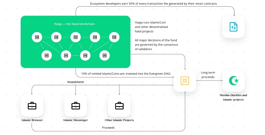 • Jedes Mal, wenn eine neue islamische Münze geprägt wird, werden 10 % in ein spezielles Evergreen DAO eingezahlt, um weiter in islambezogene Unternehmungen zu investieren oder an muslimische Wohltätigkeitsorganisationen zu spenden. Dies ist die erste Einführung einer Münze, die der muslimischen Gemeinschaft einen direkten wirtschaftlichen Wert bringt.