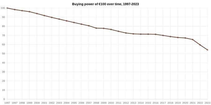 Infolgedessen wird der Euro weiterhin sehr schnell an Kaufkraft verlieren (seit 1997 hat der Euro bereits 46 % seiner Kaufkraft verloren).