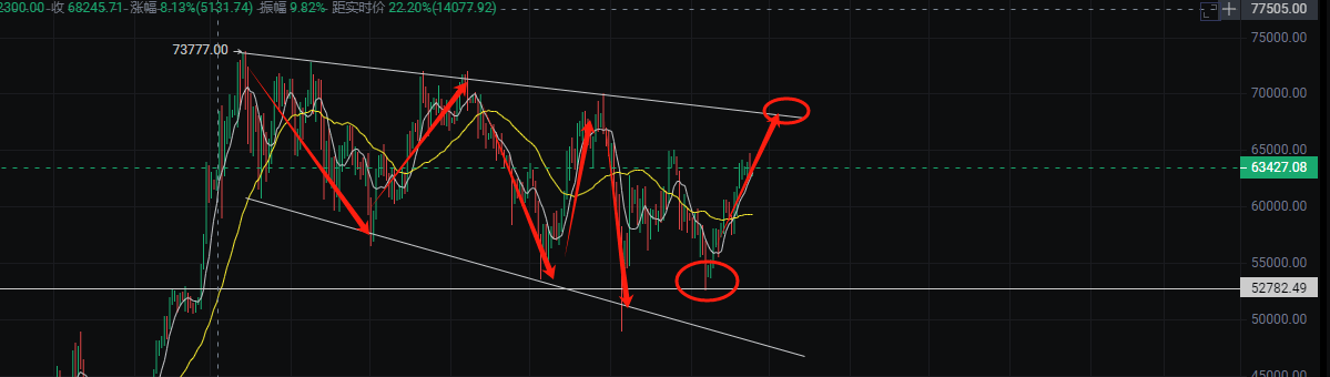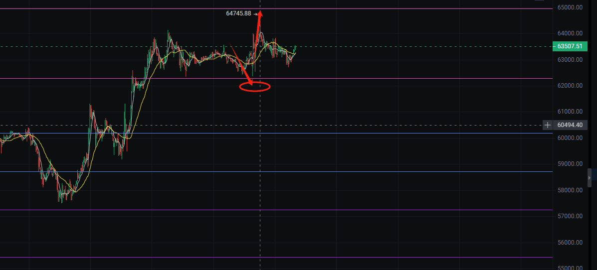 Wenn die Fibonacci-Durchschnitte nach oben zeigen, schwankt der 30-Minuten-Durchschnitt zwischen 62.500 und 65.000 Punkten. Der Trend befindet sich in einer Konsolidierungsphase. Bei einem Aufwärtstrend zielen wir daher primär auf einen Rückgang ab. Wir eröffnen direkt eine Long-Position am Unterstützungsniveau von 625 Punkten des Kanals. Solange es keinen signifikanten Ausbruch gibt, warten wir im Wesentlichen auf eine Erholung! Natürlich steige ich normalerweise von der rechten Seite in den Markt ein, da ich als professioneller Trader den Markt den ganzen Tag über beobachte!