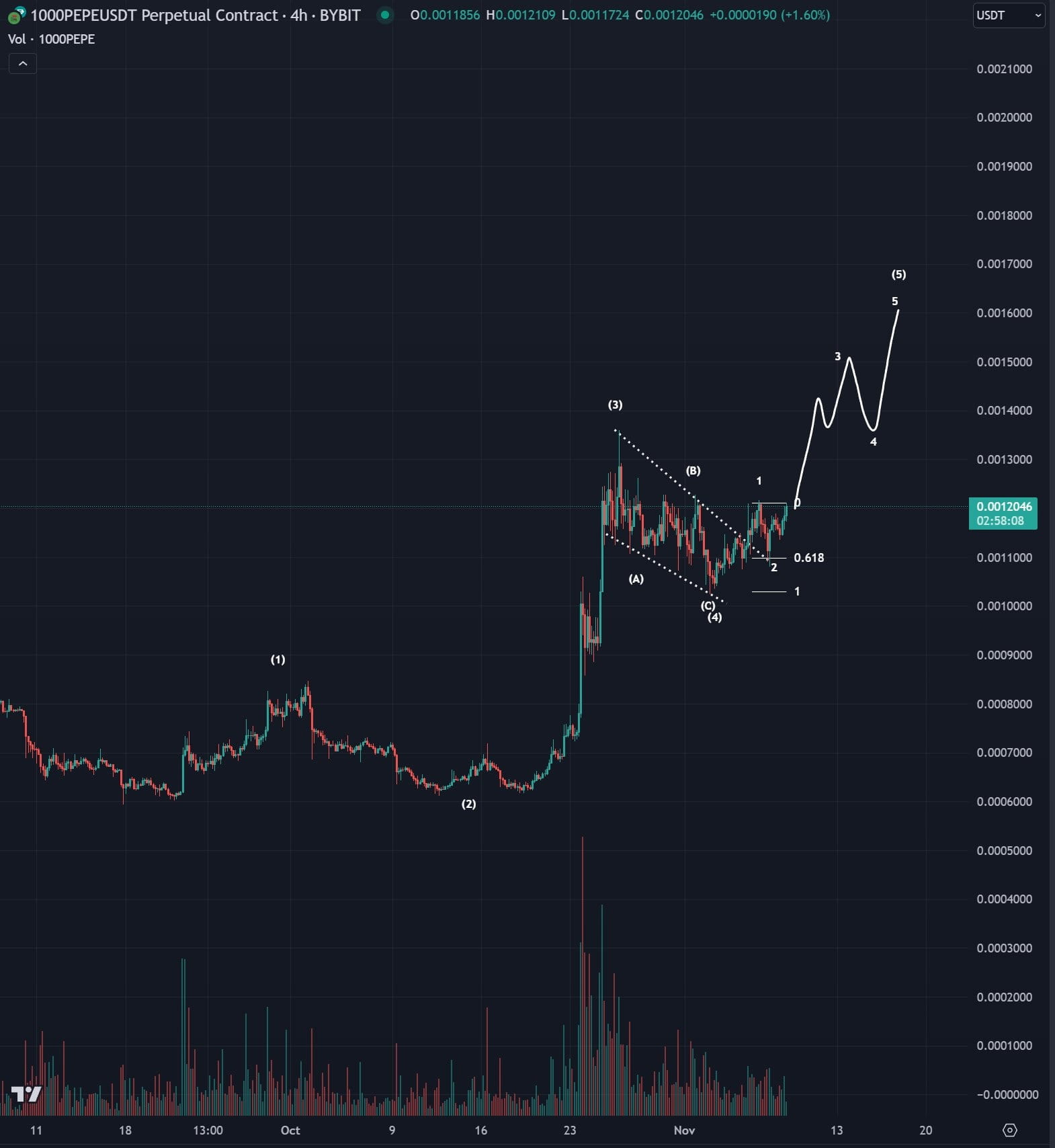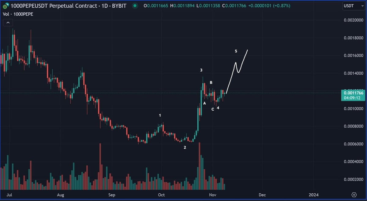 Mit Blick auf sein Diagramm meint der Händler, dass die fünfte Welle dazu führen würde, dass Pepe bei etwa 0,00000160 $ gehandelt würde.