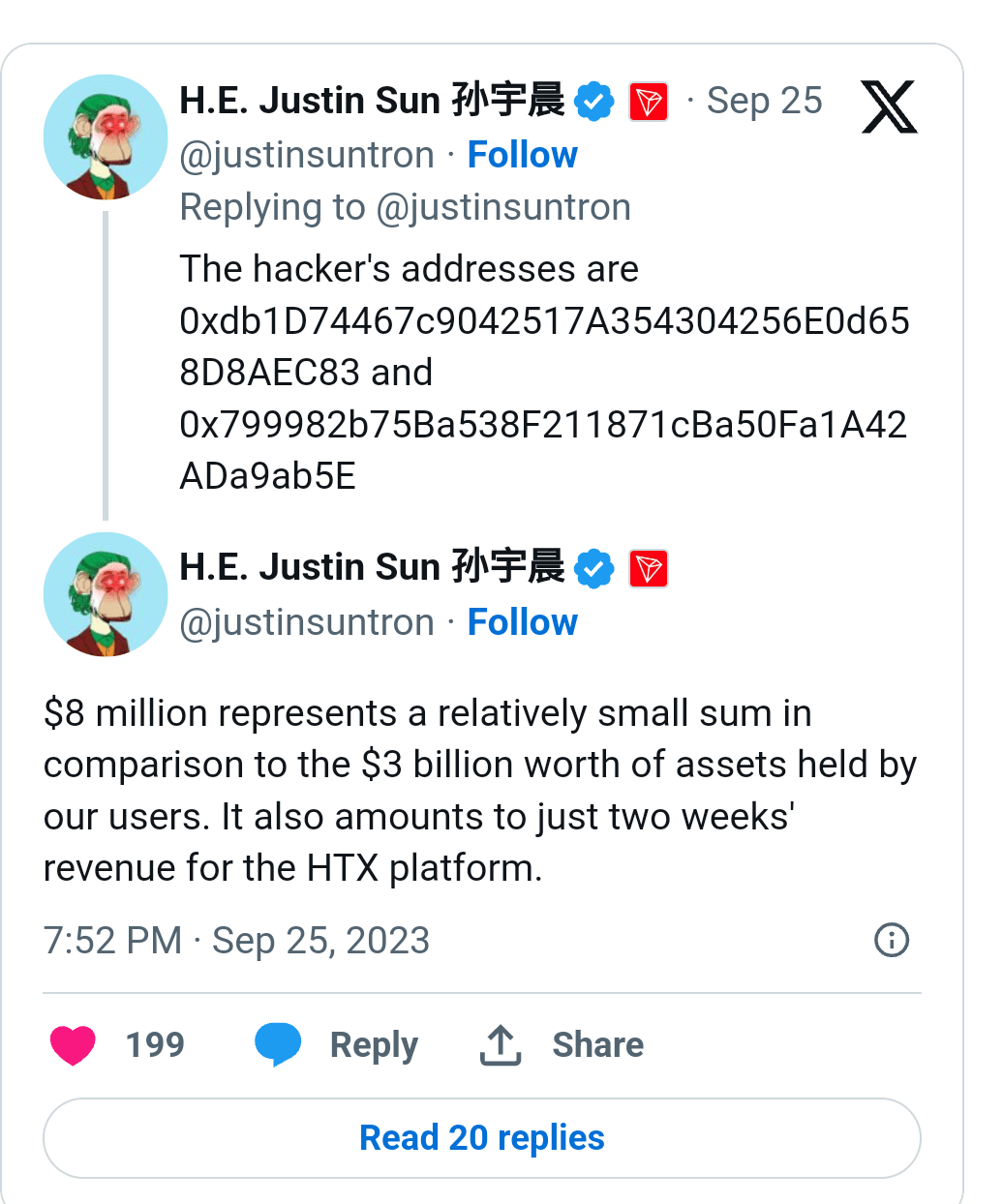 In September, $8 million about 500 ETH was drained from HTX, an exchange which Sun invests in, and stated that the losses made up two weeks’ revenues which have been fully recovered.