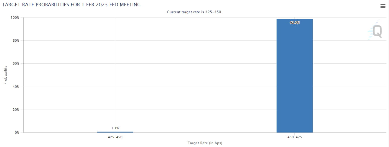 Der stets effiziente Markt glaubt, dass wir beim nächsten FOMC 25 Basispunkte erreichen werden. Dies wird derzeit mit 98,9 %iger Sicherheit gesagt, was einer Chance von 1 % auf 50 Basispunkte entspricht: im Kontext einer Abschwächung des PCE und eines starken Arbeitsmarktes.