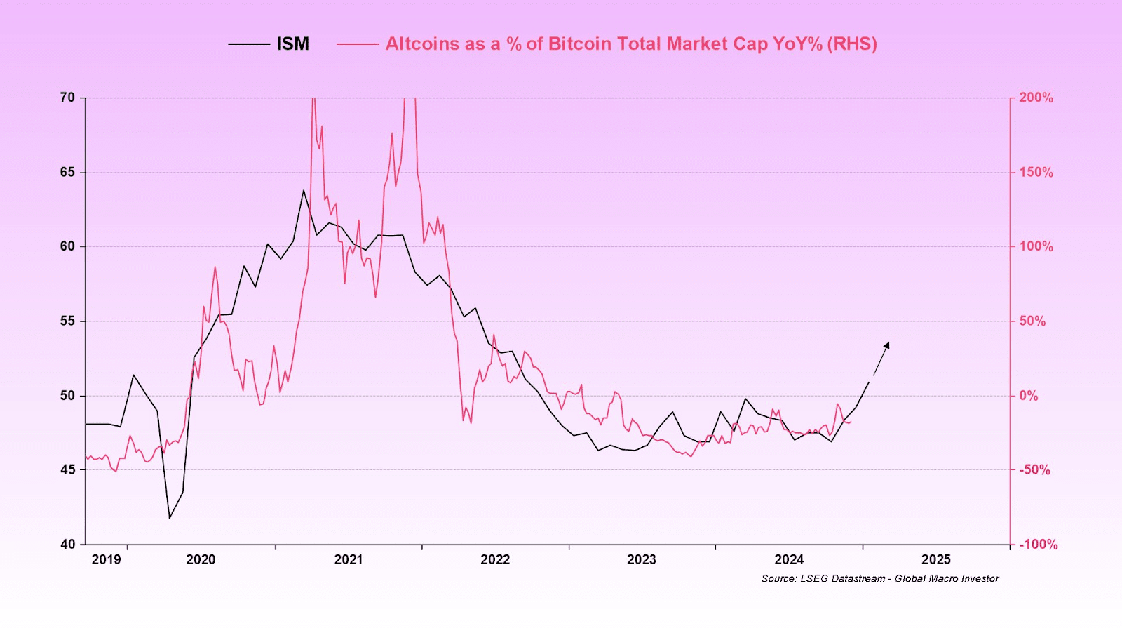 Nicht nur Bitcoin, auch das Kapitalisierungsverhältnis von Altcoins zu Bitcoin zeigt wieder Anzeichen eines Anstiegs. Historisch gesehen tendierten Geldflüsse dazu, von Bitcoin zu Altcoins zu fließen, wenn der ISM wuchs und die finanziellen Bedingungen sich lockerten, was eine Altcoin-Saison schuf. Wenn dieser Trend anhält, könnten Investoren in naher Zukunft eine Explosion von Altcoins sehen.