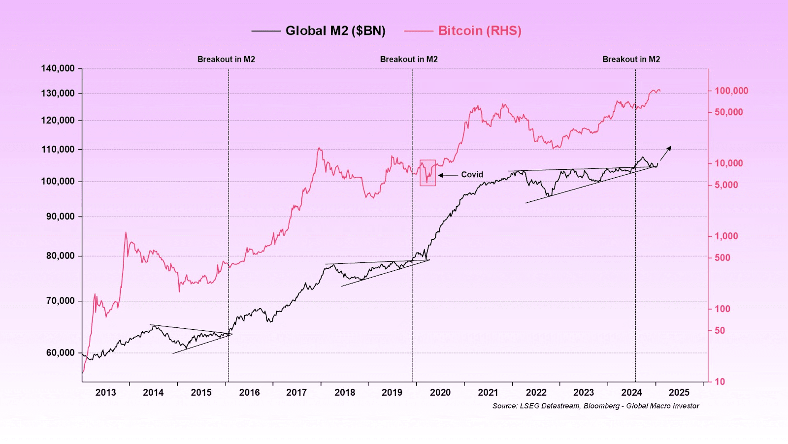 Die globale Geldmenge (M2) spielt ebenfalls eine wichtige Rolle. Die Beziehung zwischen Bitcoin und M2 deutet darauf hin, dass die starken bullischen Zyklen von BTC oft mit Phasen der Expansion der Geldmenge zusammenfallen. Derzeit zeigt das globale M2 wieder Anzeichen von Wachstum, was mehr Liquidität für den Kryptomarkt schaffen und Schwung für die nächste Rallye von Bitcoin geben könnte.