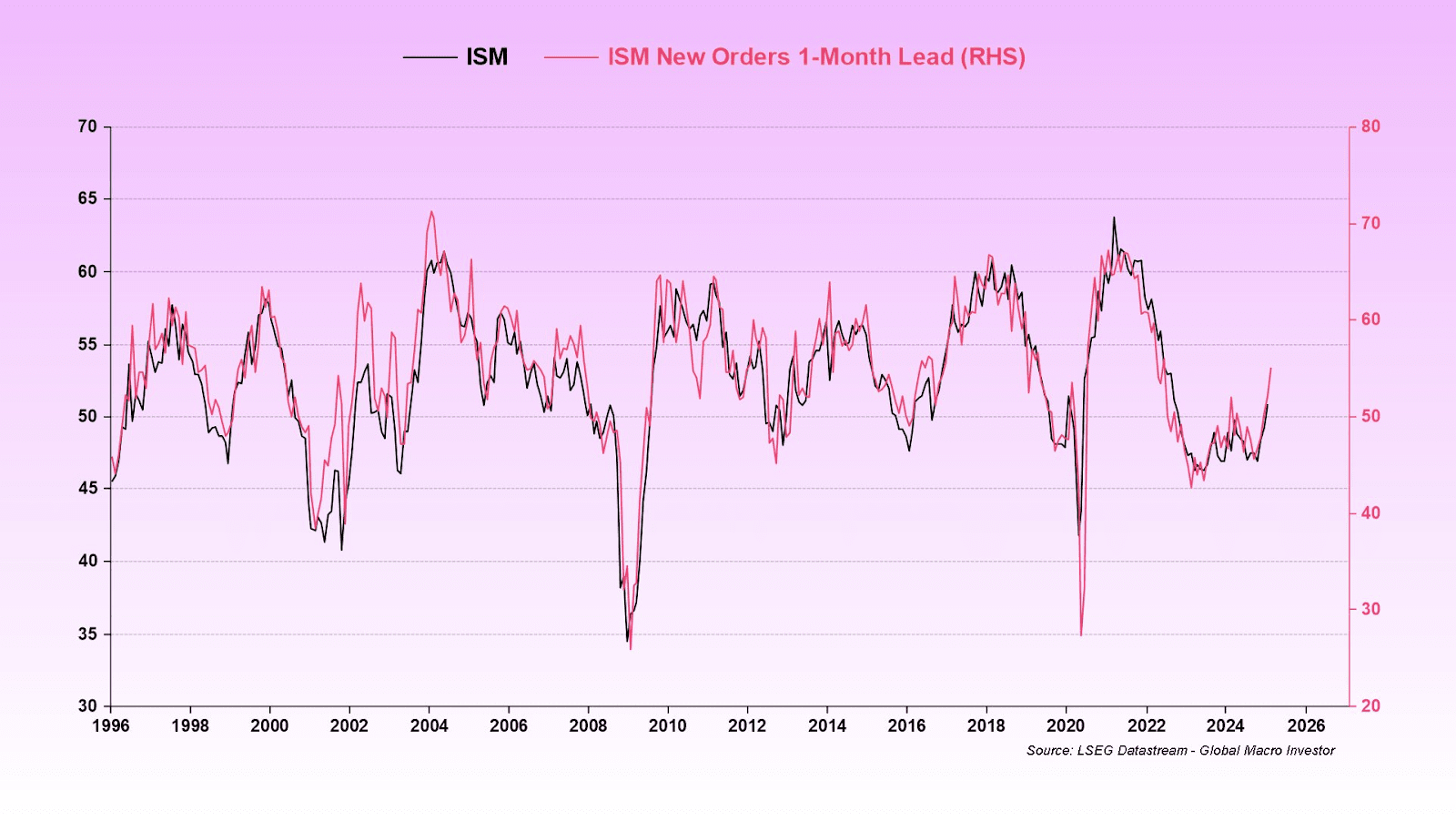 ISM-Neuaufträge, der einmonatige ISM-Leading-Indicator, steigen, was darauf hindeutet, dass die Nachfrage in der Fertigung sich erholt – ein positives Signal für die Wirtschaft und die Finanzmärkte.