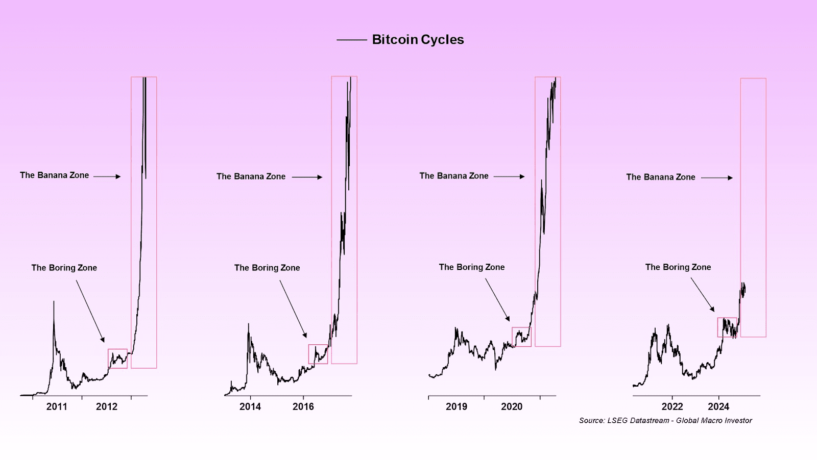 Das Bitcoin-Zyklusdiagramm zeigt, dass BTC die Langweilige Zone verlassen und in die Bananen-Zone eintreten könnte, die stärkste Boomphase in den vorherigen Zyklen. In früheren Bullenläufen durchlief Bitcoin eine Phase der Akkumulation, bevor es ein starkes Wachstum in einem parabolischen Muster erlebte. Wenn die Geschichte sich wiederholt, könnte Bitcoin sich in der Phase der Vorbereitung auf eine signifikante Rallye befinden.