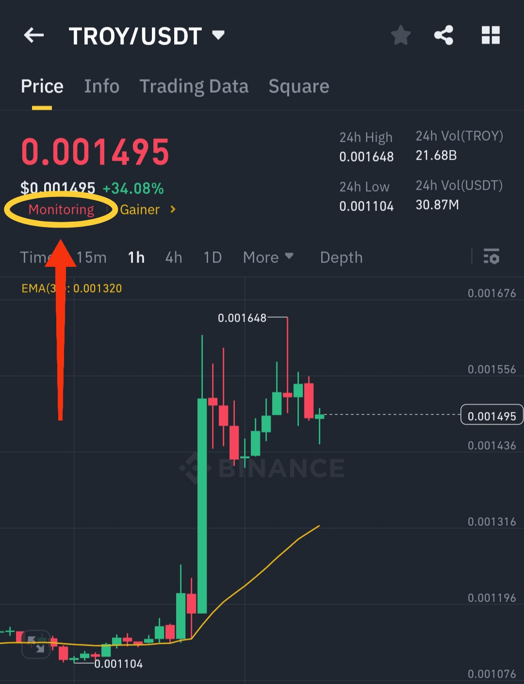 Binance markiert eine Münze als "Überwachung", wenn sie aufgrund von strenger Beobachtung unterliegt: