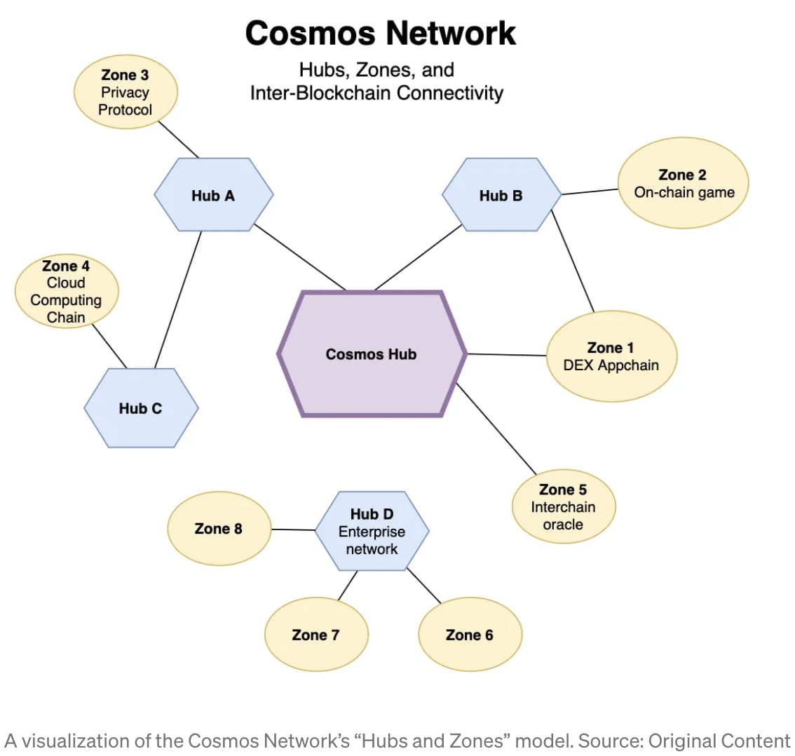 Im Zentrum des Cosmos-Netzwerks steht der „Cosmos Hub“, die erste „Hub“-Kette, die auf dem Cosmos-Netzwerk aufgebaut wurde, und fungiert im Wesentlichen als „Grand Central Station“ für alle anderen Hubs und Zonen. Wie im obigen Diagramm gezeigt, müssen „Hubs“ jedoch nicht unbedingt mit dem Cosmos Hub verbunden sein. Ein privates Unternehmen könnte sich beispielsweise dafür entscheiden, einen eigenen privaten Hub zu starten, der seine eigenen privaten Zonen verbindet.