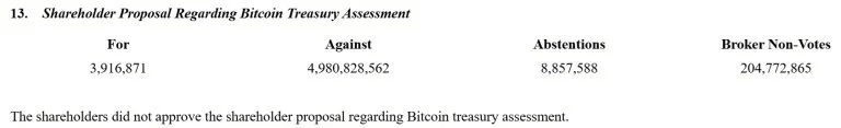 Meta Platforms Inc. lehnte eine von den Aktionären unterstützte Initiative ab, die hinzufügte, Bitcoin zu seinem Unternehmensschatz zu erkunden, während der Jahreshauptversammlung am 28. Mai. Die Aktionäre stimmten über vierzehn Vorschläge ab, die alle in einer vorherigen Einreichung bei der US-Börsenaufsicht (SEC) vom 17. April detailliert beschrieben waren. Die Teilnahme war erheblich, da 92,61 % der kombinierten Stimmkraft der Klasse A- und Klasse B-Aktien vertreten waren, was ein Quorum für die proceedings gewährte.