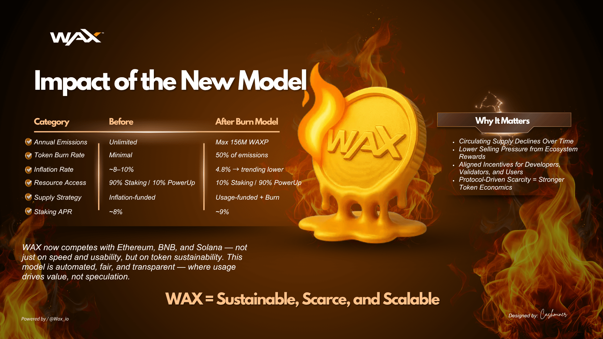 Im Herzen dieser Transformation steht eine Obergrenze für Emissionen – maximal 156 Millionen WAXP pro Jahr – und ein Engagement auf Protokollebene, 50 % aller Token-Emissionen dauerhaft zu verbrennen. Es ist nicht nur eine Anpassung. Es ist ein grundlegendes Redesign, wie Wert innerhalb des#WAXecosystem .