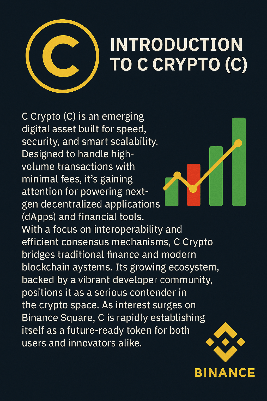C Crypto (C) ist ein aufkommendes digitales Asset, das für Geschwindigkeit, Sicherheit und intelligente Skalierbarkeit entwickelt wurde. Entworfen, um Transaktionen in hoher Menge mit minimalen Gebühren zu bewältigen, gewinnt es zunehmend Aufmerksamkeit, um nächste Generationen dezentraler Anwendungen (dApps) und Finanztools zu betreiben. Mit Fokus auf Interoperabilität und effiziente Konsensmechanismen verbindet C Crypto traditionelle Finanzsysteme mit modernen Blockchain-Systemen. Sein wachsendes Ökosystem, unterstützt durch eine lebendige Entwicklergemeinschaft, positioniert es als ernstzunehmender Konkurrent im Krypto-Sektor. Mit steigendem Interesse auf Binance Square etabliert sich C rasch als zukunftssicheres Token sowohl für Nutzer als auch für Innovatoren.