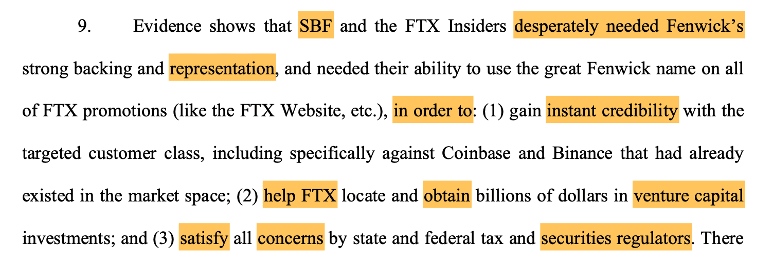 Die geänderte Klage besagt, dass strafrechtliche Verfahren gegen den ehemaligen FTX-CEO Sam Bankman-Fried neue Informationen über Fenwicks Beteiligung enthüllten. FTX-Mitbegründer Gary Wang, die ehemalige CEO von Alameda, Caroline Ellison, und der ehemalige CTO Nishad Singh sagten aus, dass Fenwick über den Missbrauch von Geldern informiert war und Ratschläge gab, wie man solche Praktiken verbergen kann. Singh behauptet insbesondere, die Firma habe geholfen, unbefugte Kredite zu verschleiern und gefälschte Finanzberichte zu erstellen.