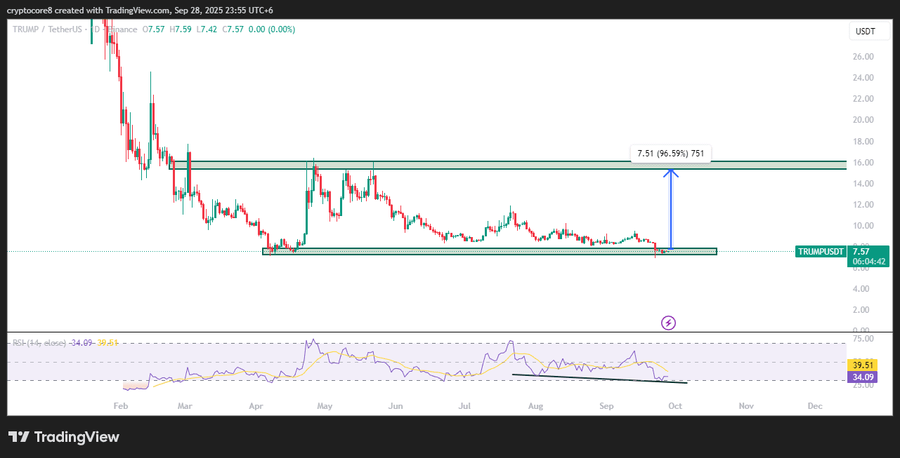 Dieses TRUMPUSDT-Diagramm zeigt, dass der Preis stark im Unterstützungsbereich gehalten wird, mit einer bullishen Divergenz im RSI. Der blaue Pfeil signalisiert einen möglichen Anstieg in Richtung des Widerstandsbereichs, der fast den Wert verdoppelt, was auf einen starken bullischen Trend hindeutet.