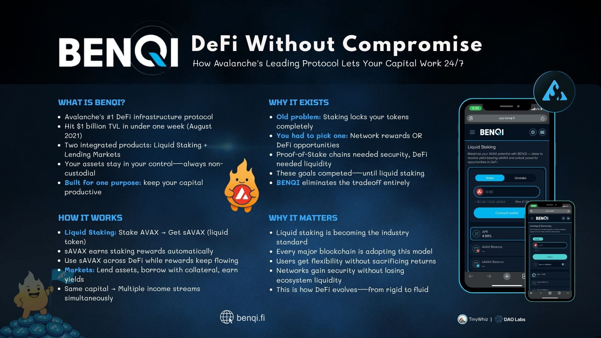 Auf #Avalanche hochleistungsfähiger Infrastruktur aufgebaut, funktioniert BENQI als Suite von DeFi-Protokollen, die um ein zentrales Prinzip herum gestaltet sind: Ihre Vermögenswerte sollten immer arbeiten. Die Plattform kombiniert zwei Hauptprodukte—BENQI Liquid Staking und BENQI Märkte—um ein Ökosystem zu schaffen, in dem Liquidität frei fließt, während mehrere Einkommensströme generiert werden.