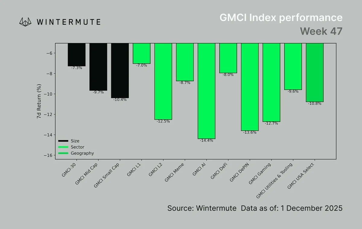 🔻 Die am stärksten betroffenen Sektoren: KI (–14,4%), DePIN (–13,6%), Gaming (–12,7%), L2 (–12,5%) #Smallcaps (–10,4%), #Midcaps (–9,7%), L1s (–7,0%)