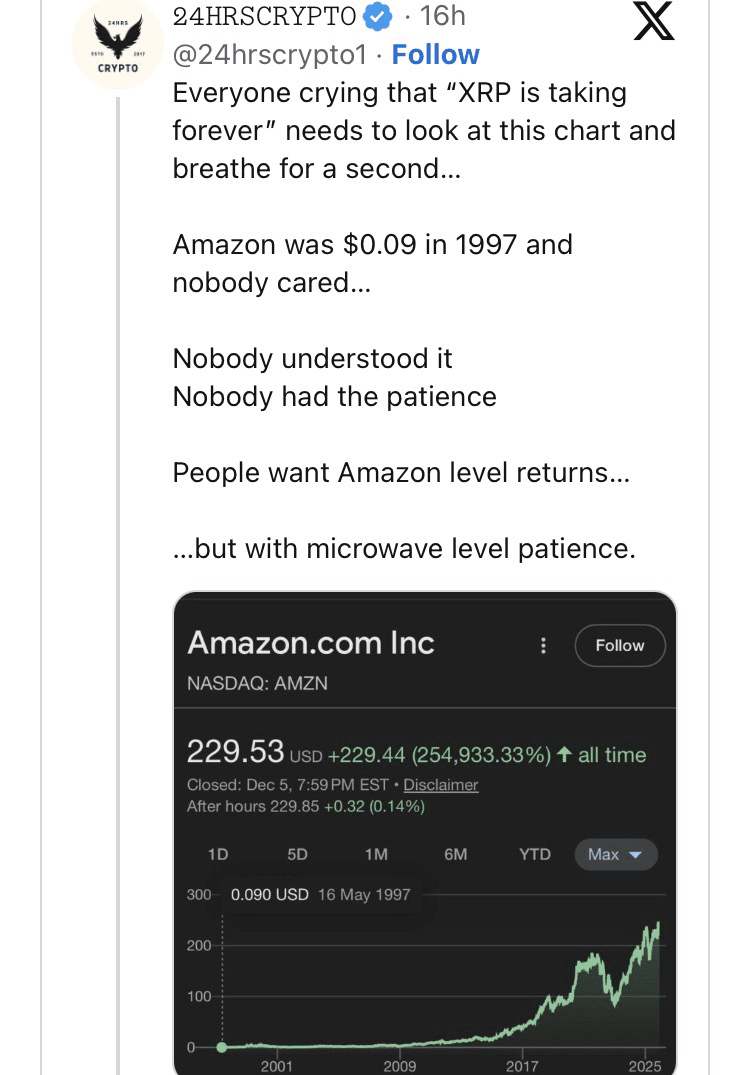 In einem Tweet hob 24hrscrypto1, ein weit verbreiteter Kommentator zu XRP, Amazons historische Grafik hervor, die seinen Anstieg von 0,09 $ im Jahr 1997 auf mehr als 229 $ im Laufe der Zeit zeigt. Bemerkenswerterweise zeigt die Grafik, dass Amazons Aktienkurs während seiner Lebensdauer um 254.933% gestiegen ist.
