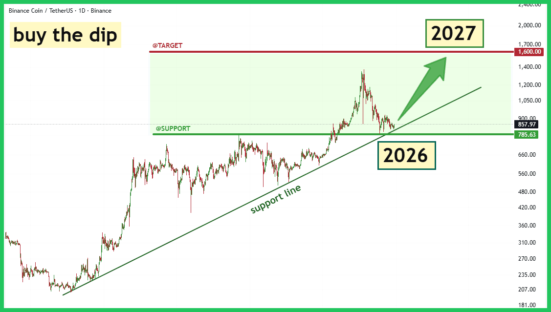 Wenn wir uns den 1D-Chart ansehen, hat sich $BNB perfekt bis zur Konfluenz zweier wichtiger Unterstützungsniveaus zurückgezogen. Die langfristige steigende Unterstützungstrendlinie wurde getestet, was mit der entscheidenden horizontalen Unterstützungszone zwischen $785 und $830 übereinstimmt. Die aktuelle Preisbewegung (rund $857) deutet darauf hin, dass hier starker Bedarf in den Markt dringt. Das Halten dieser Zone ist absolut entscheidend für die Fortsetzung des makroökonomischen Aufwärtstrends. Unser primäres langfristiges Ziel, basierend auf struktureller Expansion, bleibt das Niveau von $1,600.
