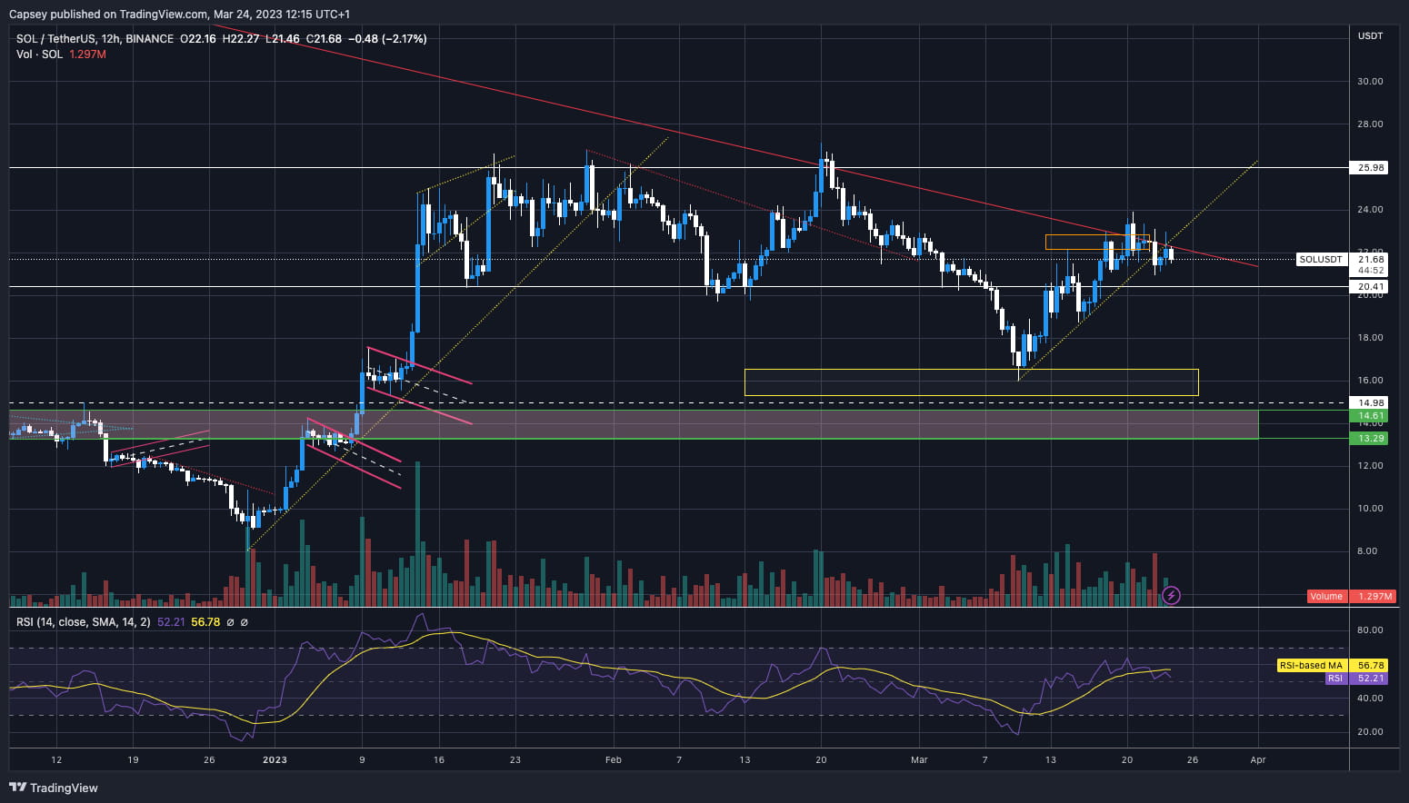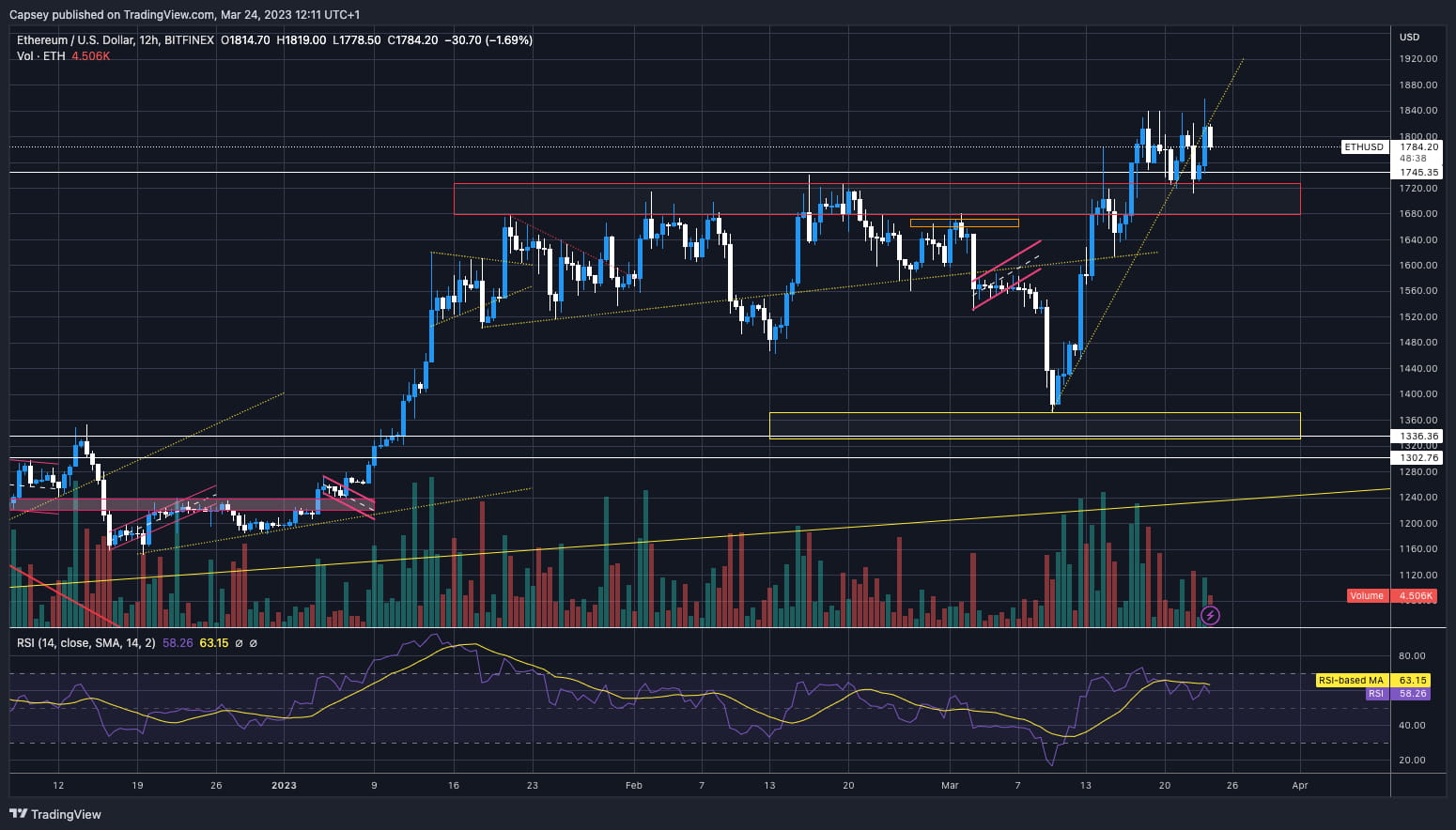 Hier gibt es kontrastierende Signale. Der Bullenfall ist, dass wir über der horizontalen Unterstützung von 1.745 $ liegen und der RSI weder im überkauften Bereich noch in der Nähe davon ist, sondern sich jetzt in einem ziemlich mittleren Bereich befindet. Der Bärenfall ist, dass wir ohne großen Rückgang deutlich gestiegen sind. Wir sehen jetzt auch, dass der Preis unter der lokalen Aufwärtstrendlinie liegt. Meiner Meinung nach gibt es hier einen großen Kontrast. Ich denke, der Markt steht vor einem Rückgang, aber ETH scheint robust genug zu sein, um nicht deutlich zurückzufallen. Bessere Gelegenheiten anderswo, insbesondere bei BTC.