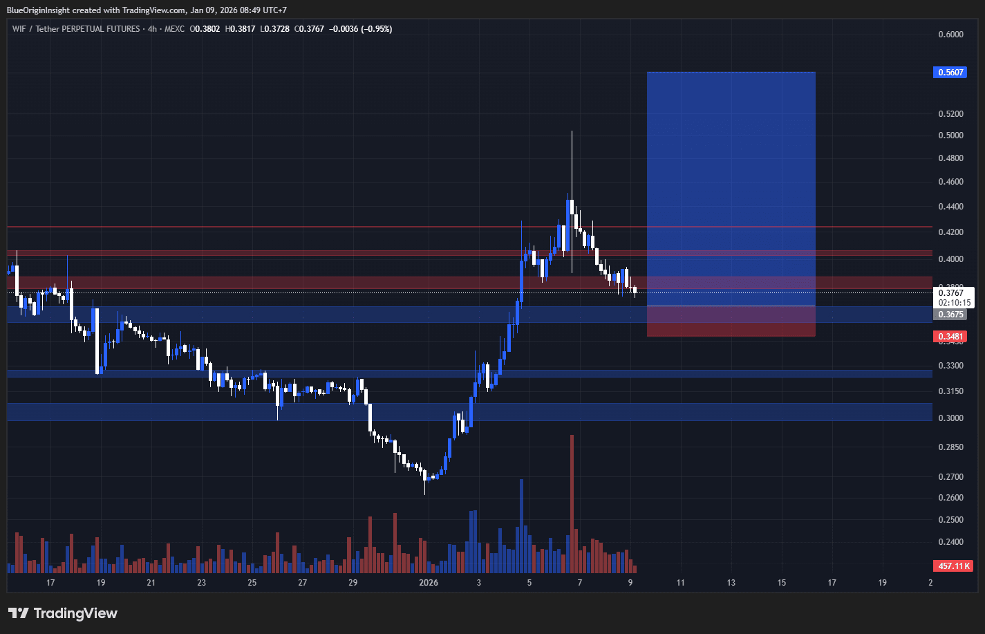 $WIF hat gerade eine starke impulsive Bewegung abgeschlossen und zieht sich nun in eine eindeutig definierte Nachfragezone auf dem 4H-Chart zurück. Dies ist kein zufälliger Abverkauf, die Korrektur ist strukturiert und erfolgt nach einer sauberen Ausdehnung.