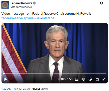 Der Vorsitzende der Federal Reserve, Jerome Powell, erklärte, dass er einem beispiellosen Druck ausgesetzt sei – angeblich sogar mit Androhung strafrechtlicher Verfolgung. Er warf dem Justizministerium (DOJ) vor, versuchen zu wollen, die Fed zu beeinflussen, weil sie weiterhin Zinssätze auf Basis wirtschaftlicher Indikatoren festlegt und nicht auf die Präferenzen des Präsidenten.